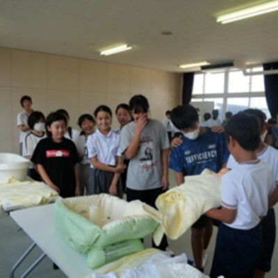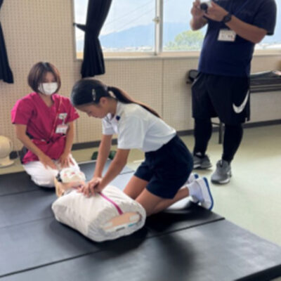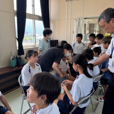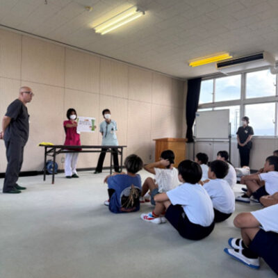 地域の未来を担う子どもたちに、看護という立場から「いのち」と「防災」「健康」への関心を育んでいただく機会となりました。内容は、いのちを守るための防災のクイズ、また、聴診器を使って自分や友だちの心臓の音を聞き、「どんな音がするかな?」と興味を持ってもらいました。