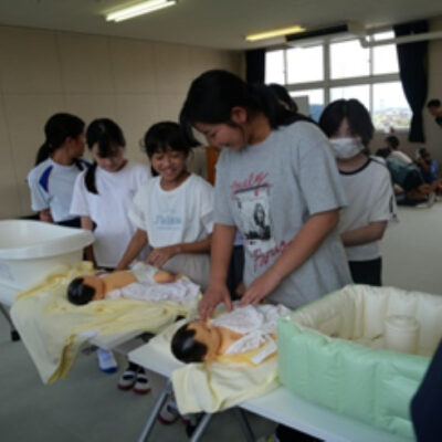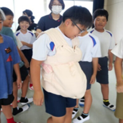 妊婦体験 では、助産師のいのちの話や 腹部の重りを使った妊婦体験をしてもらうことで「赤ちゃんが産まれる前、体が変化するとどこが大変か。」を感じてもらいました。赤ちゃん人形を使ったもく浴の体験では、小さな命の大切さを体験してもらいました。