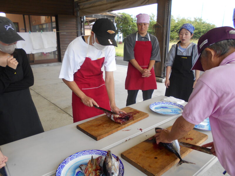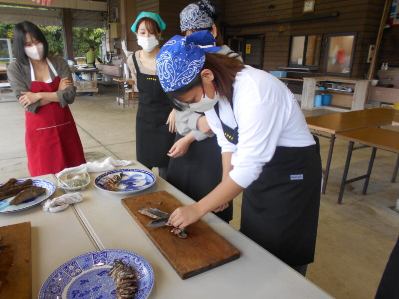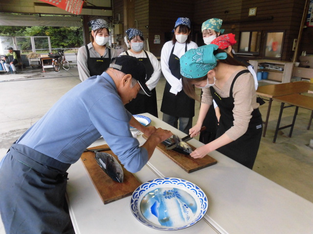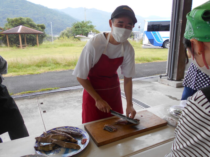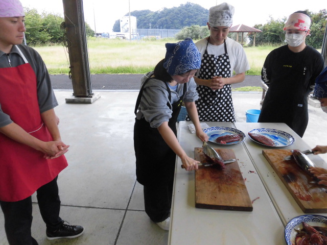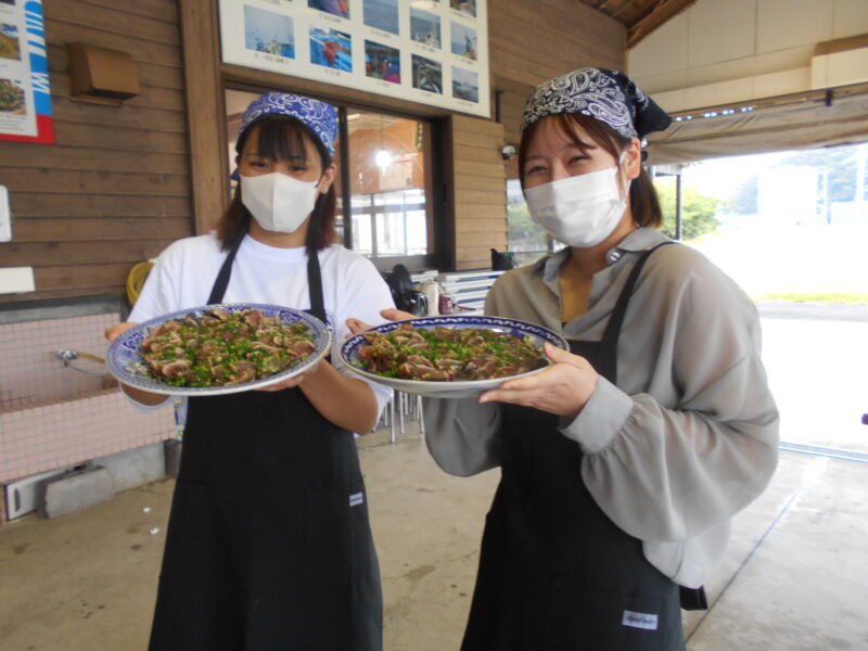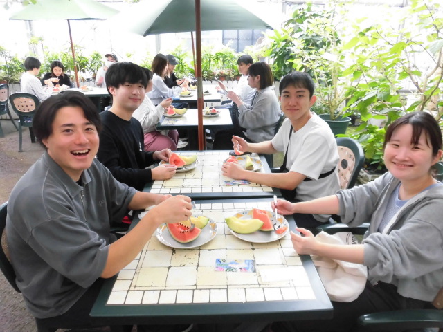 「黒潮一番館」では、皆でエプロンに着替え捌くところからタタキを作りました。自分たちで作ったタタキを堪能した後は、「四万十郷水車亭」に行き芋けんぴをお土産に購入しました。そして「西島園芸団地」に行き、メロンとスイカのデザートを食べました。最後に「道の駅風良里」で各々お土産を購入したり、皆でアイスクリームを食べたりしました。