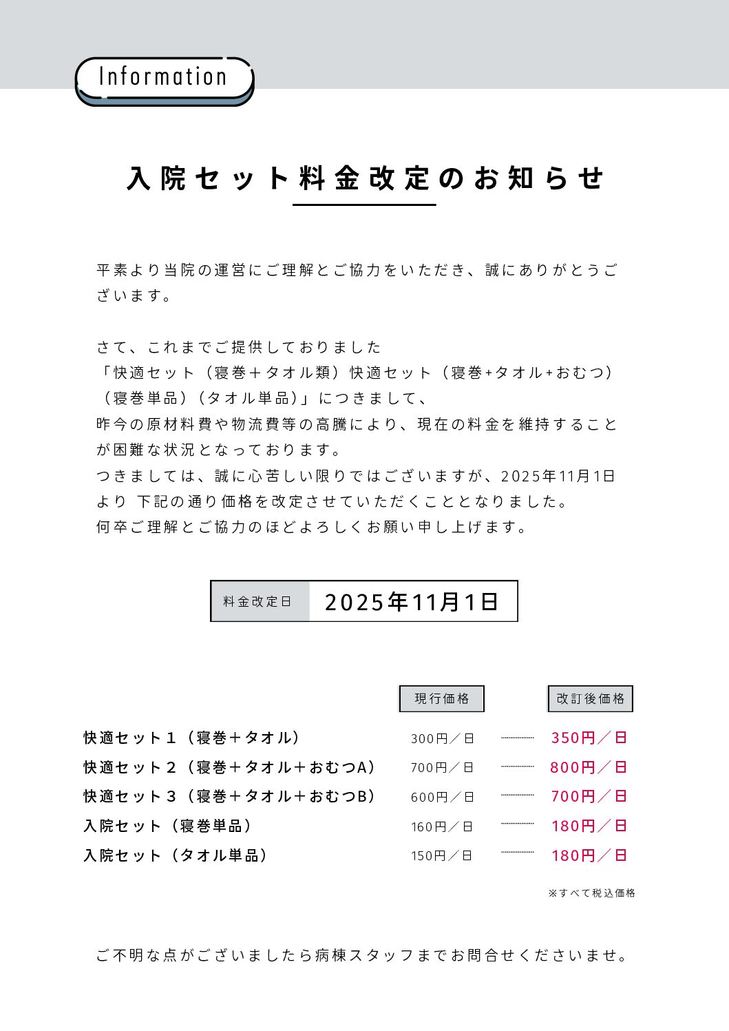 入院セット料金改定のお知らせ(2025年11月1日より)