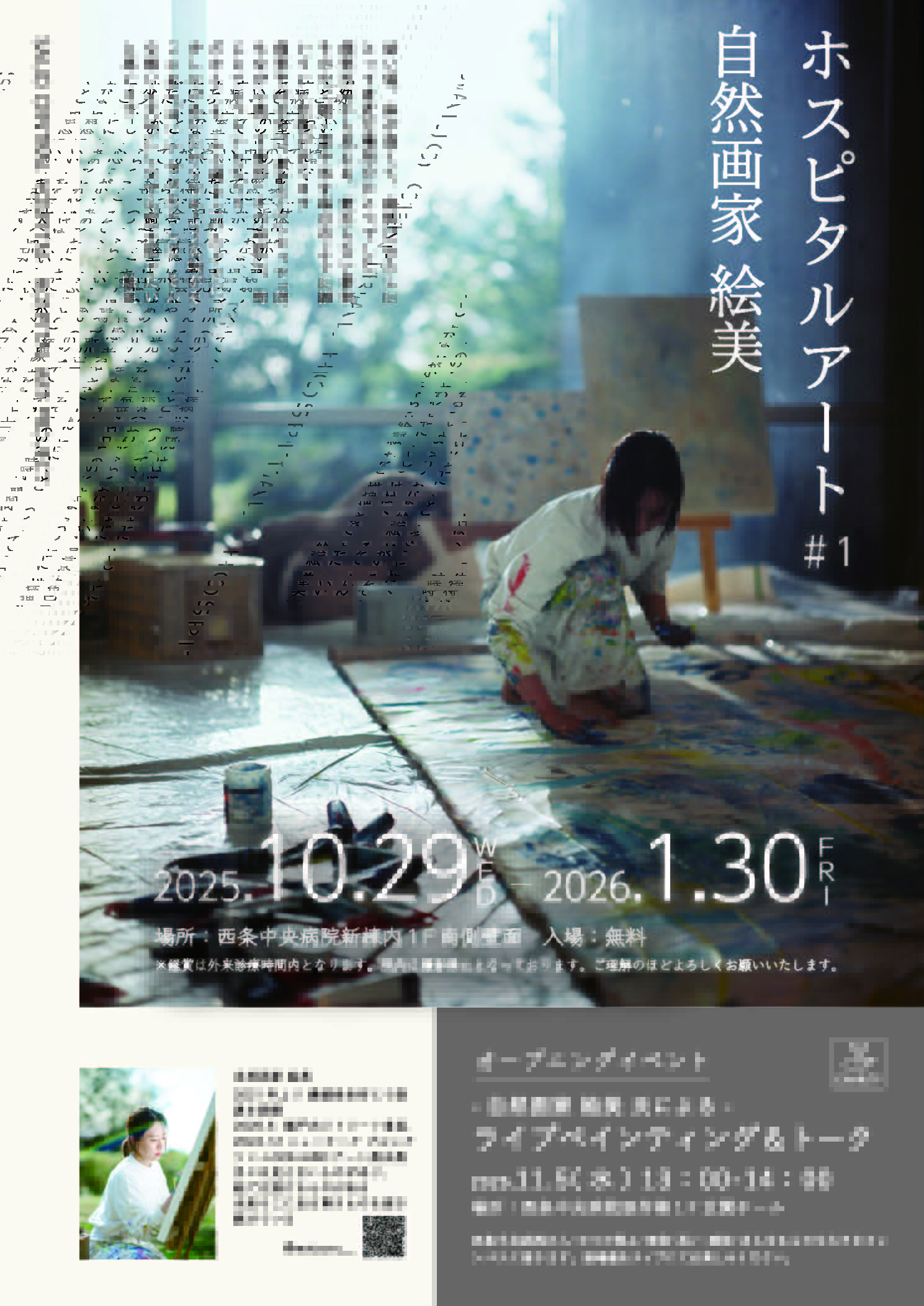 西条中央病院では、院内でアート作品を展示する「ホスピタルアートプロジェクト」を開始します。新棟1階の展示からスタートし、オープニングイベントとして自然画家・絵美氏によるライブペインティング&トークを開催します。待ち時間に寄り添う“ひと呼吸”の場を、アートの力で育んでいきます。