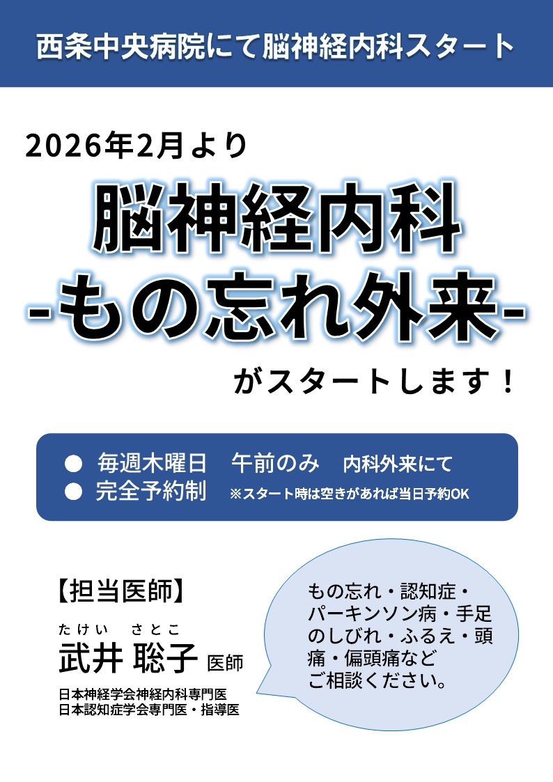 西条中央病院では、2026年2月より脳神経内科(もの忘れ外来)を新たに開設いたします。